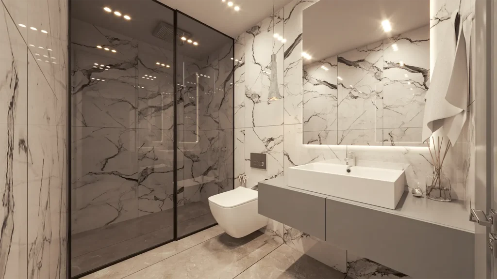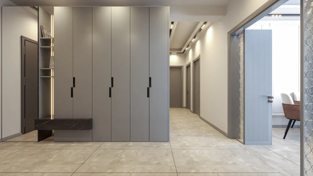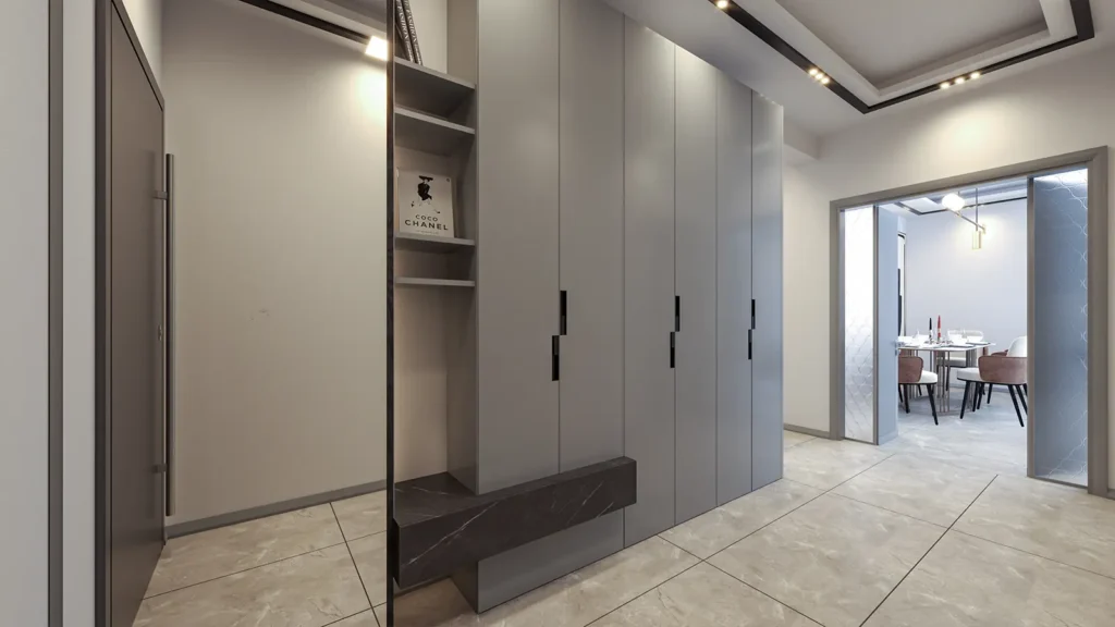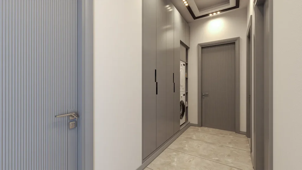 Yerden ısıtma sistemiyle desteklenen granit zemin döşemesi, koridor alanında hem konfor hem de estetik sağlıyor. Geniş yapısıyla ferah bir atmosfer sunan bu alan, sıcaklığı her köşeye eşit şekilde dağıtarak soğuk günlerde dahi evinizi sıcacık tutuyor.